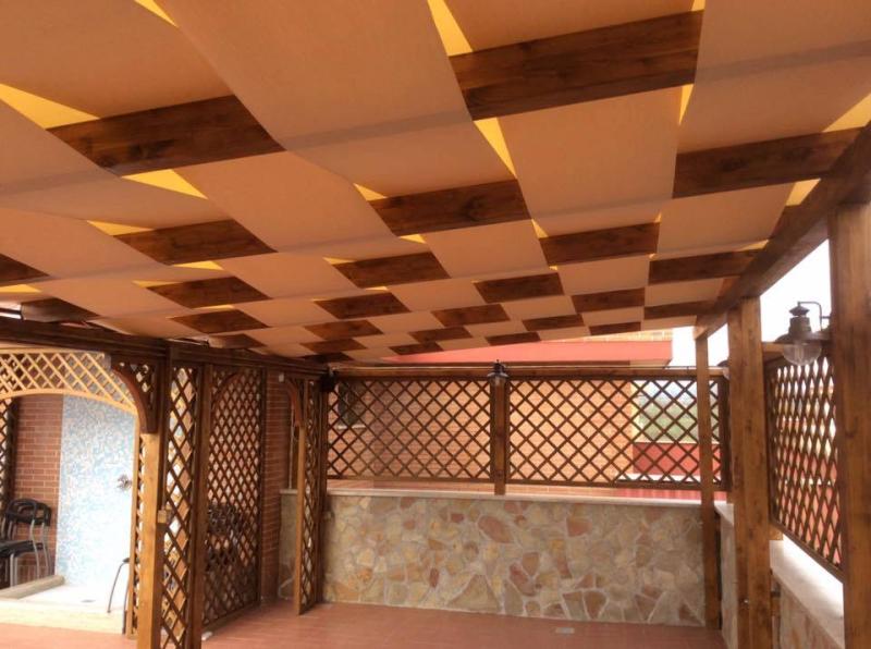 Struttura in legno lamellare da esterno con grigliati su misura,tende con sistema alla marinara e telo in pvc superiore a copertura per l'inverno (optional)